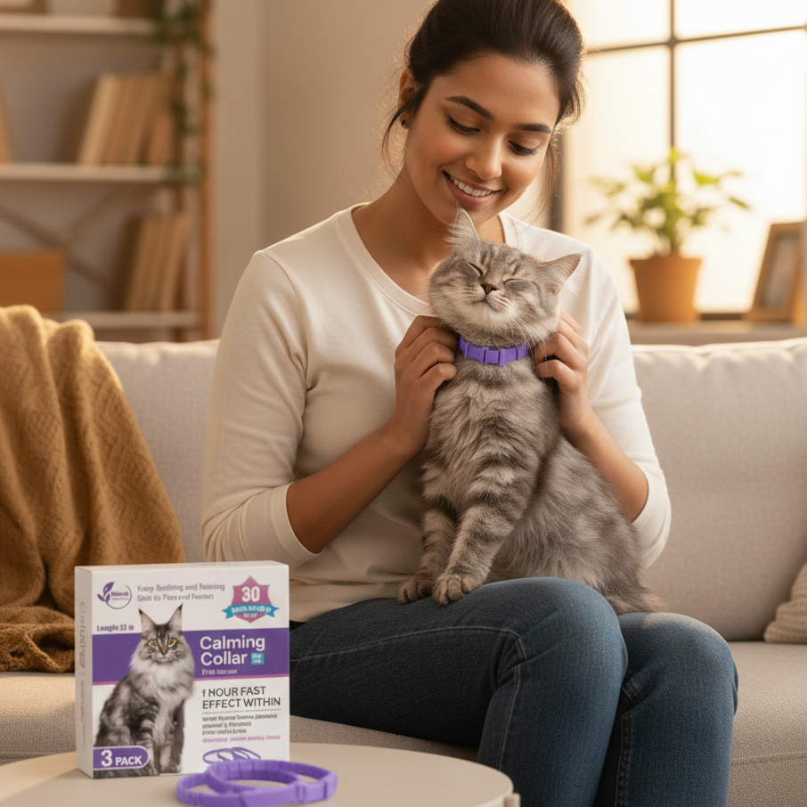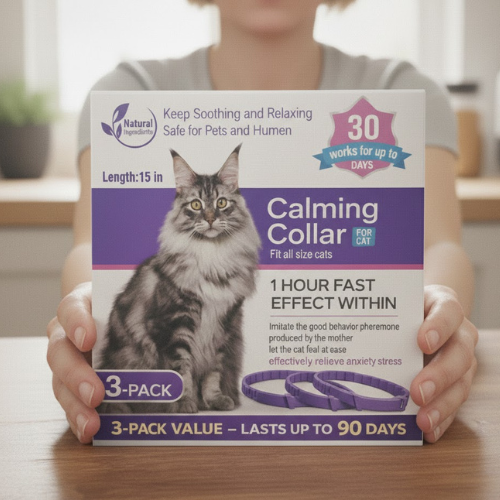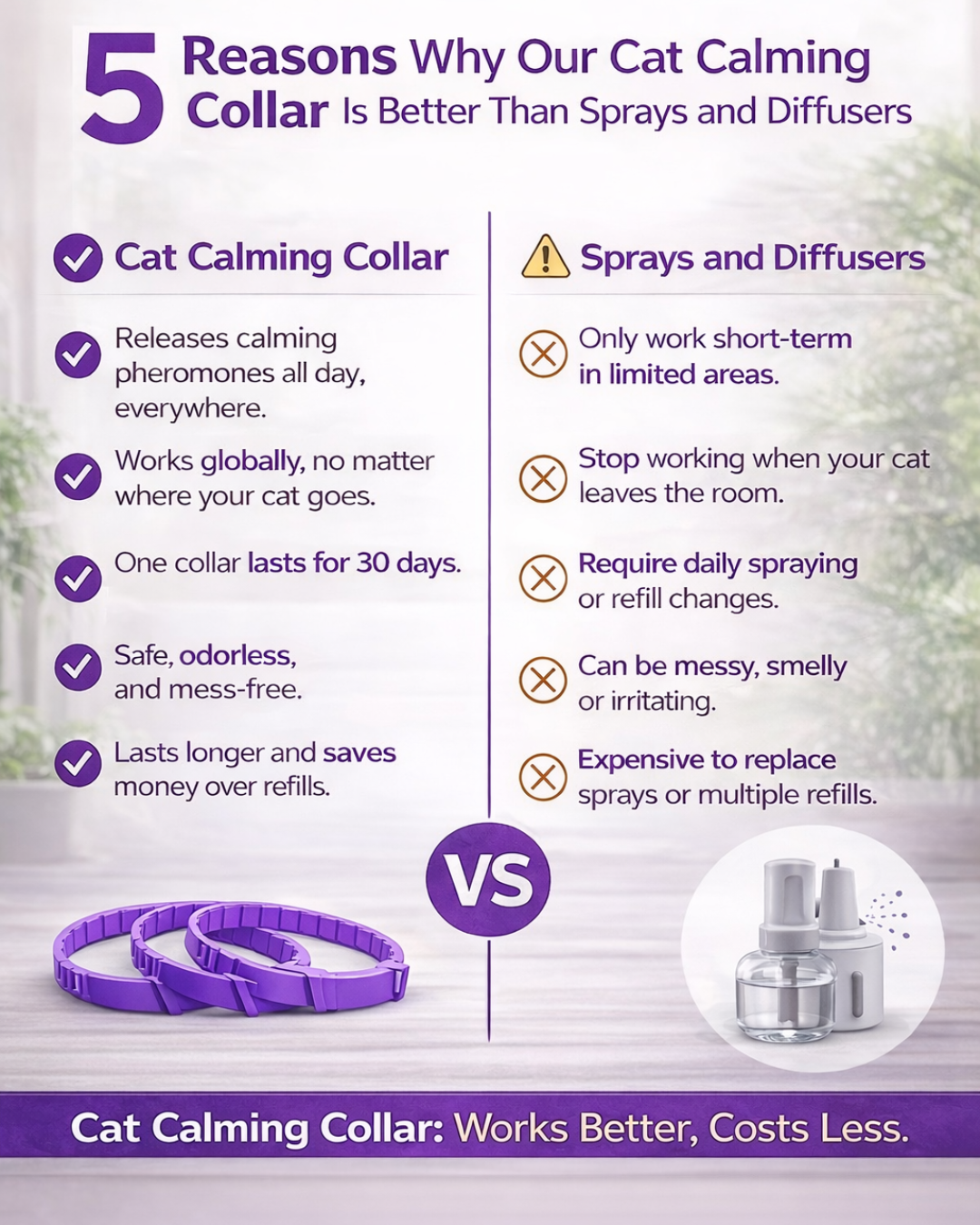 Our cat calming collar delivers continuous calming comfort all day long .Unlike sprays and diffusers, it works wherever your cat goes, not just in one room .The soothing pheromones help reduce stress, fear, and anxiety naturally .There is no mess, no daily spraying, and no plugs or refills to manage.